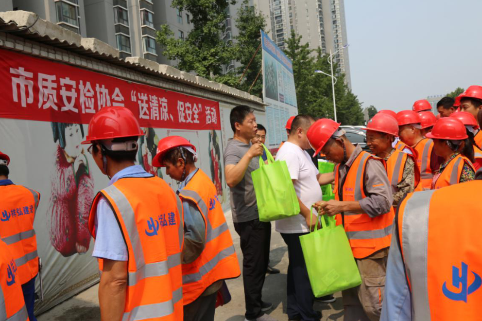 為了不影響現(xiàn)場(chǎng)施工,市質(zhì)安檢協(xié)會(huì)將慰問(wèn)活動(dòng)時(shí)間安排在11:30分工人下班時(shí)間。慰問(wèn)組向現(xiàn)場(chǎng)施工人員宣傳高溫作業(yè)要求和防暑降溫注意事項(xiàng),并發(fā)放了藿香正氣水、風(fēng)油精、洗衣粉、香皂、手套等防暑降溫用品。